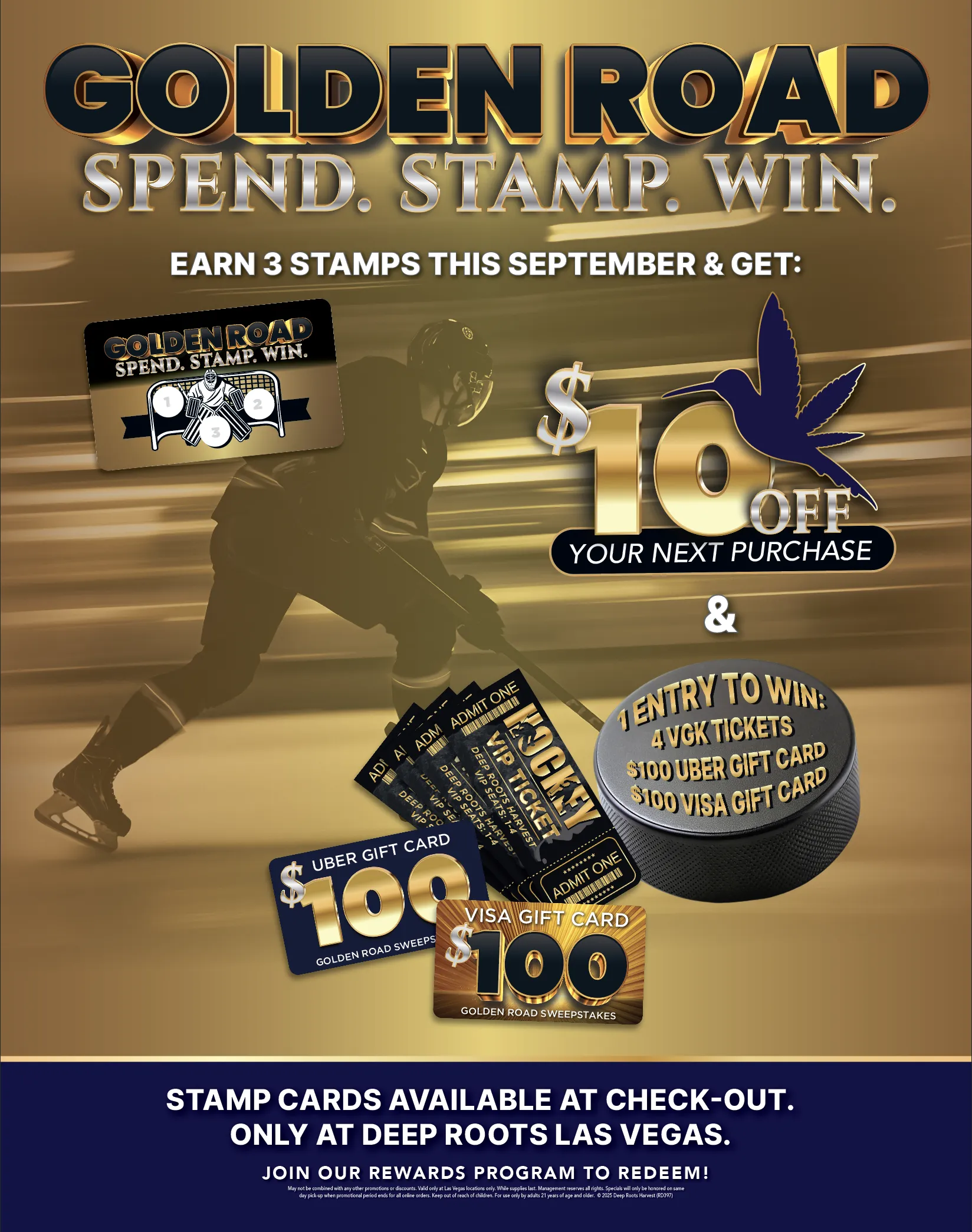 This September, Deep Roots Las Vegas is giving you another reason to stock up on your favorites. Introducing Golden Road: Spend. Stamp. Win., a limited-time rewards promotion designed to put prizes directly in your hands.